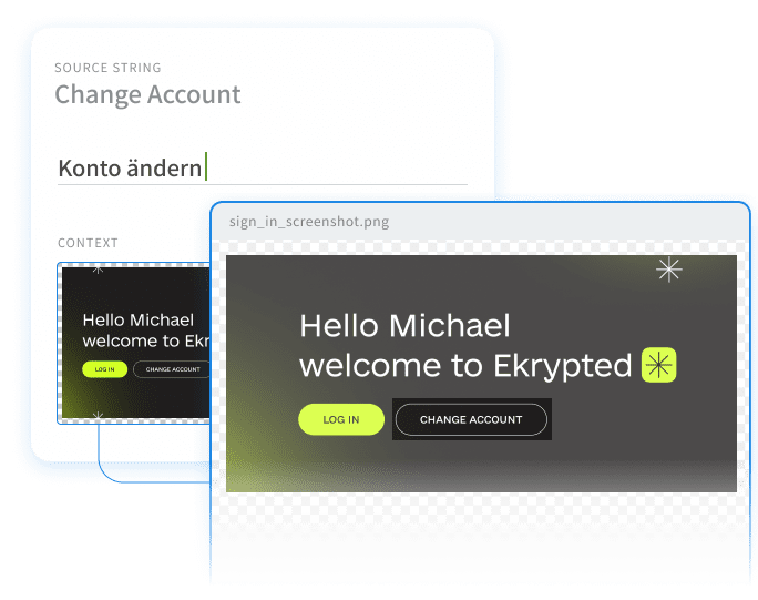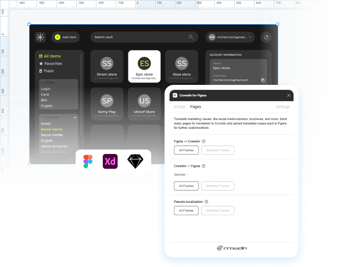 Forneça aos tradutores um contexto valioso enviando design e contexto de sua ferramenta de design (Figma, Sketch, Adobe XD) para o Crowdin.